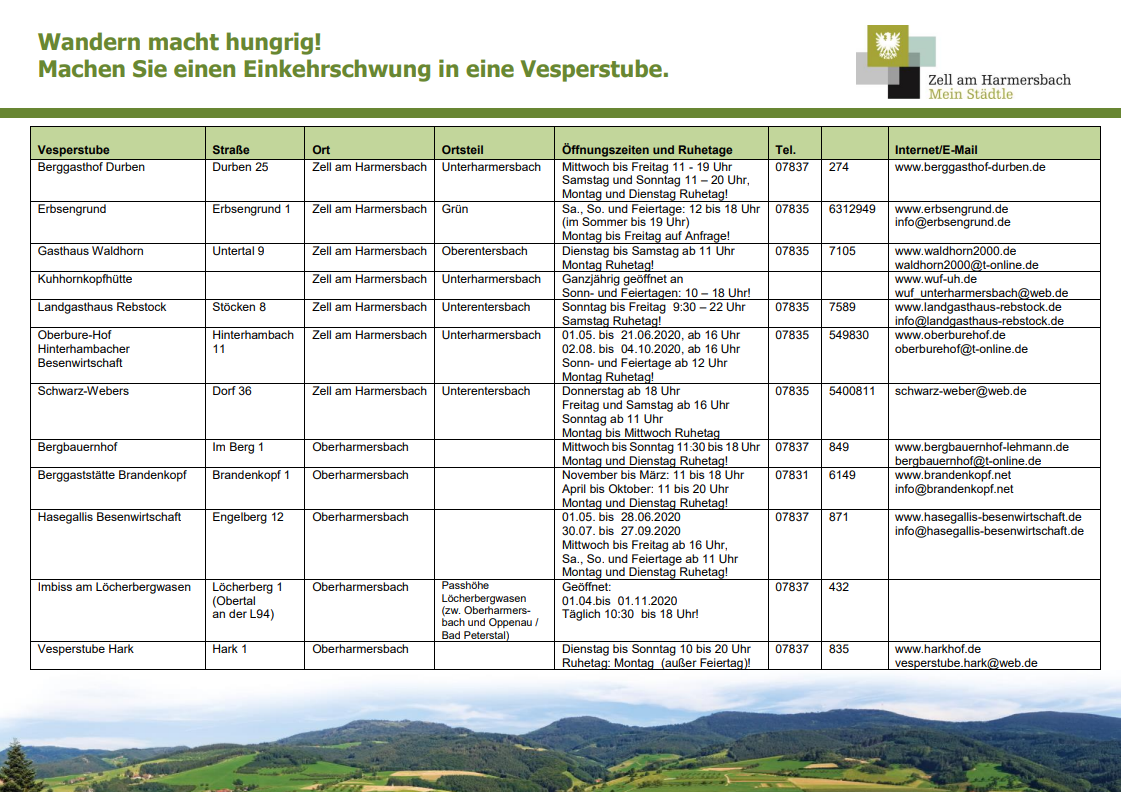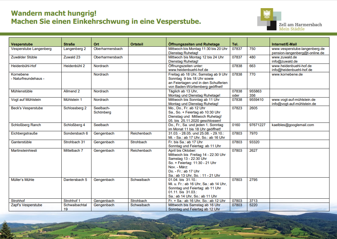 Schon die Vorstellung von gemütlichem Beisammensein und urigem Essen in einer Schwarzwälder Vesperstube macht viele Wanderer und Radfahrer glücklich. In rund 20 heimeligen Besenwirtschaften und Vesperstuben wird man in Zell und Umgebung so richtig verwöhnt. Ihre schöne Lage inmitten der Landschaft macht sie zu einem beliebten Ausflugsziel.Hier finden Sie die Vesperstuben und die Öffnungszeiten: